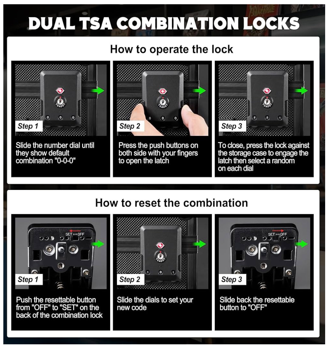 - Travel-Safe Dual TSA Locks: Built with dual combination locks approved for TSA travel. Set your own code for security and peace of mind—no loose keys needed.